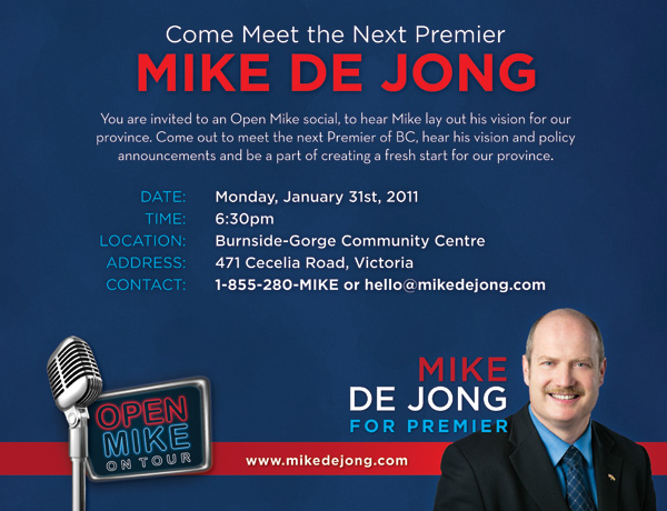 Mike de Jong is a very interesting person and has many interesting ideas for government. Even if you can not stand the Liberals, it is worth coming out to listen to him talk. Win or lose, he will be still be an important voice in the BC Liberal government.